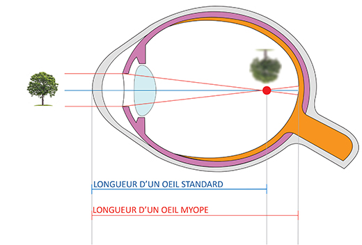 La cornée est trop bombée ou l’œil est trop long. La lumière qui passe dans un oeil myope se focalise devant la rétine. Ceci induit une image floue pour la vision de loin. Le laser Excimer va corriger l’erreur réfractive en enlevant du tissu cornéen au centre et induisant ainsi un aplatissement de la cornée. Ce changement de forme ramène vers l’arrière le point de convergence de la lumière pour une focalisation juste sur la rétine et donc obtenir une vision nette.